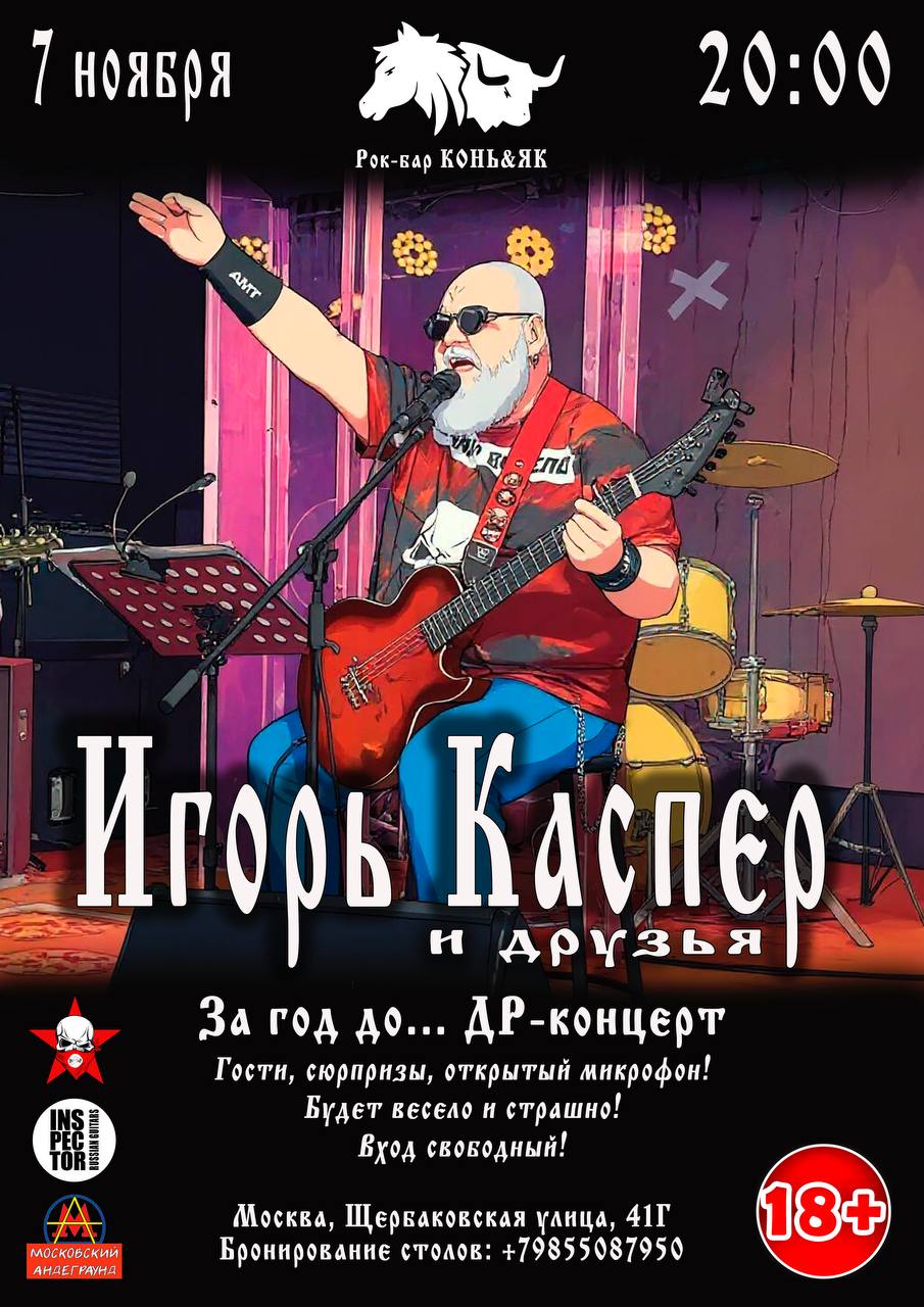 Игорь Каспер - Легенда московского андеграунда. Рок-бард. Продолжатель идей сибирского панка, так называемого "летовско-неумоевского" направления. 7 ноября в рок-баре Конь&Як празднечным концертом отметит свой День Рождения. Программа не зря носит название "За год до...", ибо в следующем году у Игоря грядут аж два юбилея - 50 лет и 35 лет творческой детельности. Ожидаются гости и […]